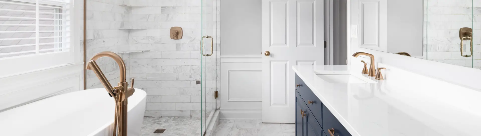 Frameless shower doors can help with the allusion of a bigger space. Sliding glass doors are another great option for easy accessibility, and you don't have to accommodate door swings.